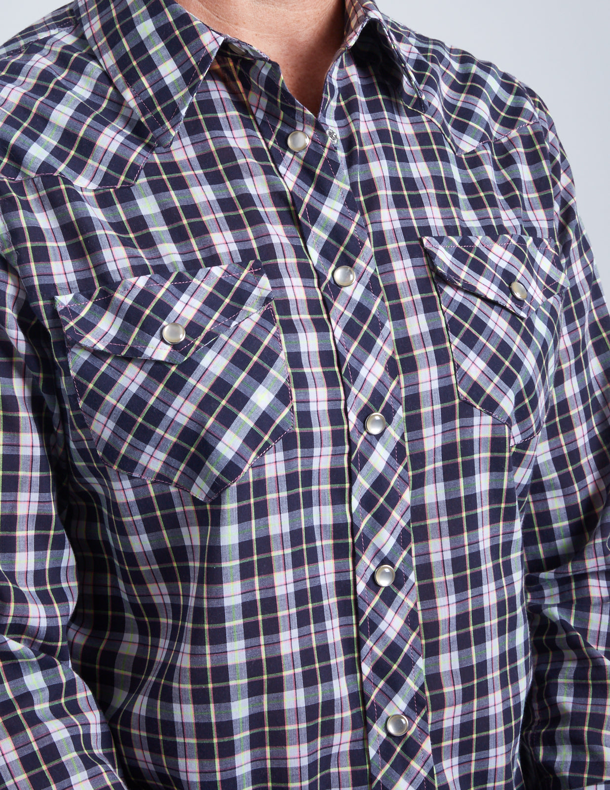 - Pearl snap closure and snap-flap chest pockets
